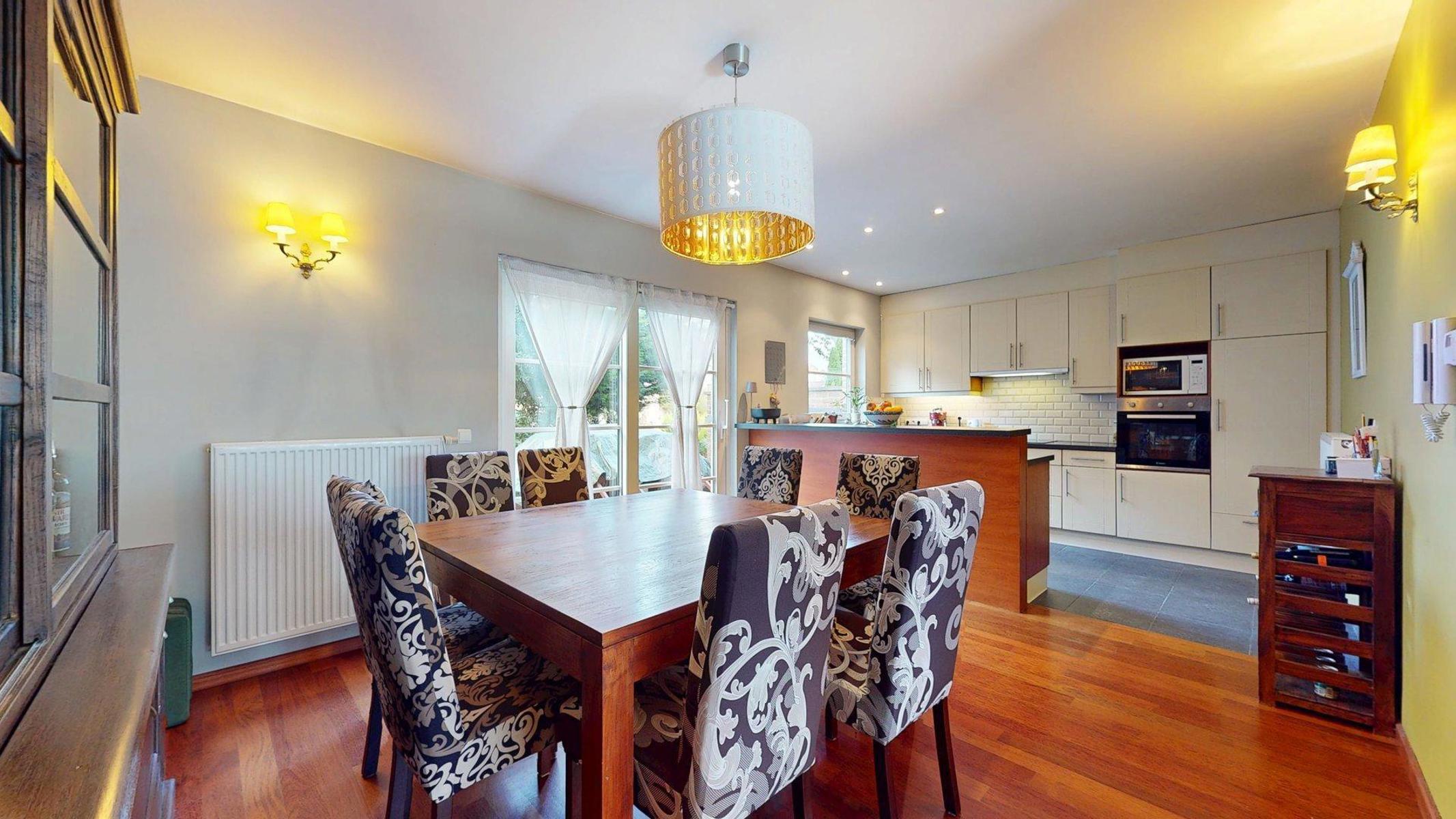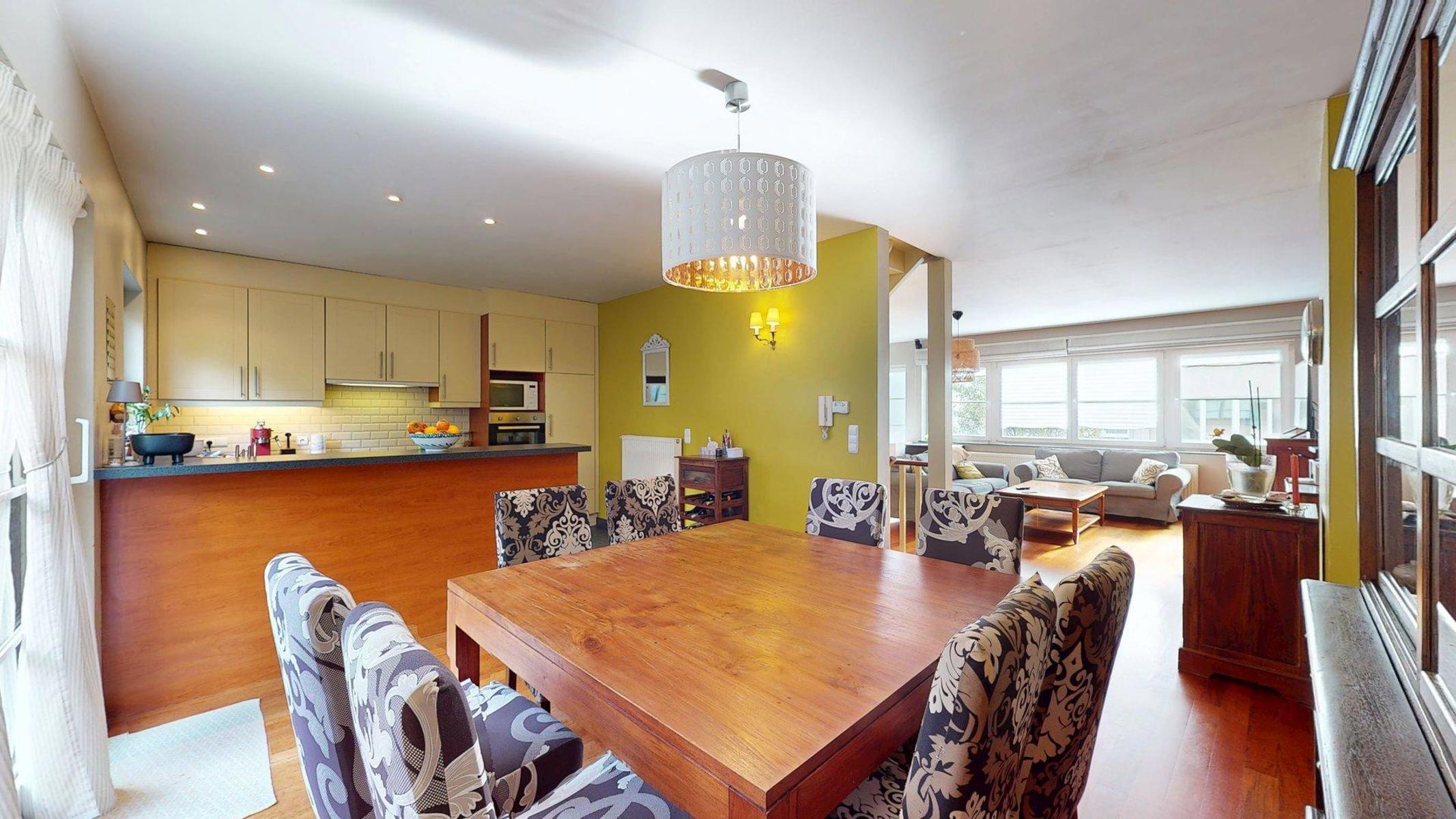 1e verdieping: ruime, lichte woonkamer, eetkamer met toegang tot het terras en de tuin, superuitgeruste keuken.